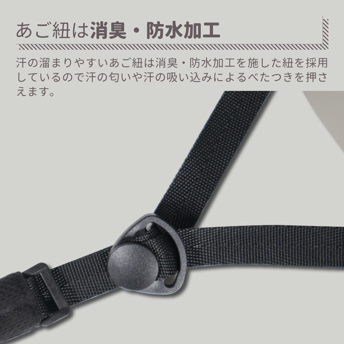 Hug capのあご紐は消臭・防水加工済みなので匂いやべたつきはありません。