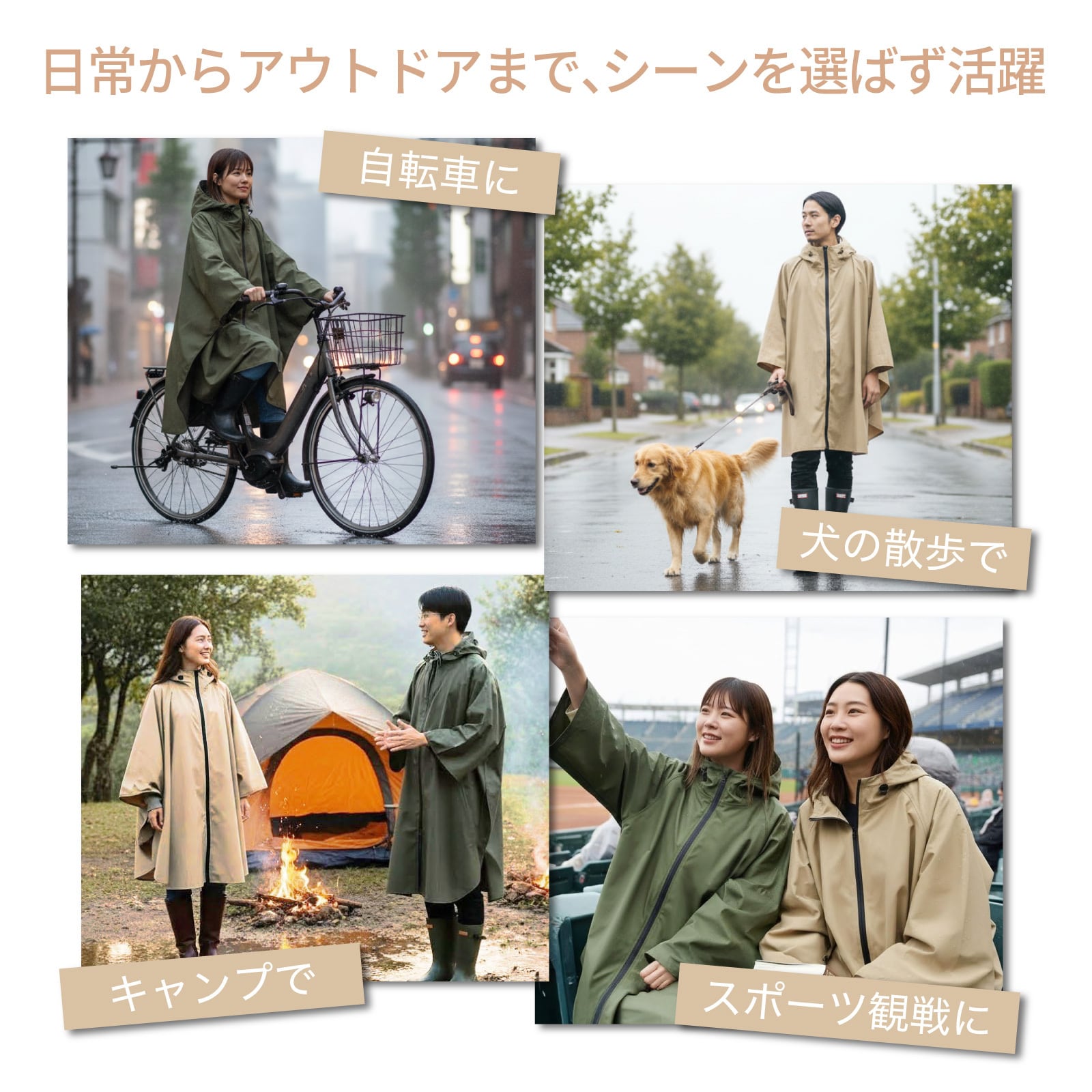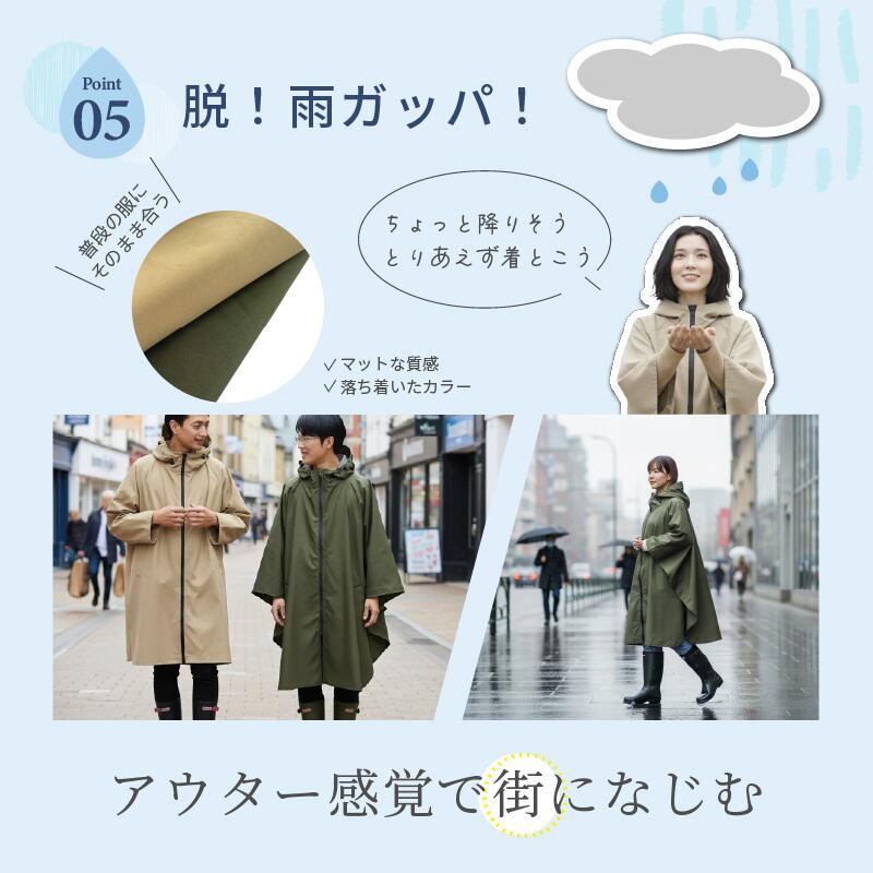 土砂降りでも大丈夫、ムレにくい。街にもなじむ高機能レインポンチョ。